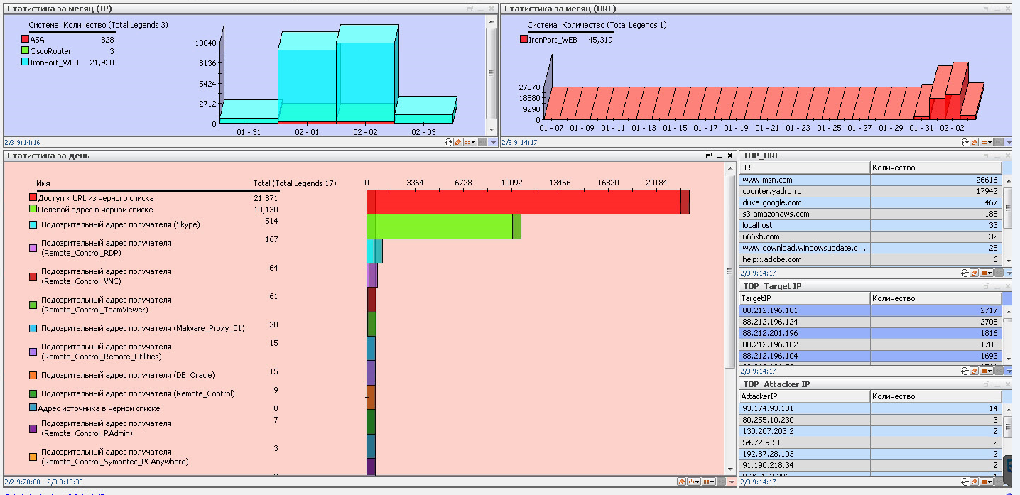 Подсистема включает в себя черные списки IP адресов и URL-ов подозрительных ресурсов, таких как бот-сети, рекламные сайты, сайты с запрещенным контентом, социальные сети и т.д. Списки автоматически обновляются и могут редактироваться. На основе данных списков формируются отчеты и информационные панели, предоставляющие статистическую информацию о пользователях, нарушающих принятые в компании политики информации.