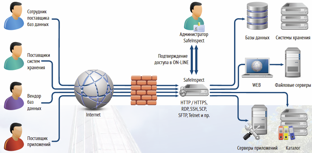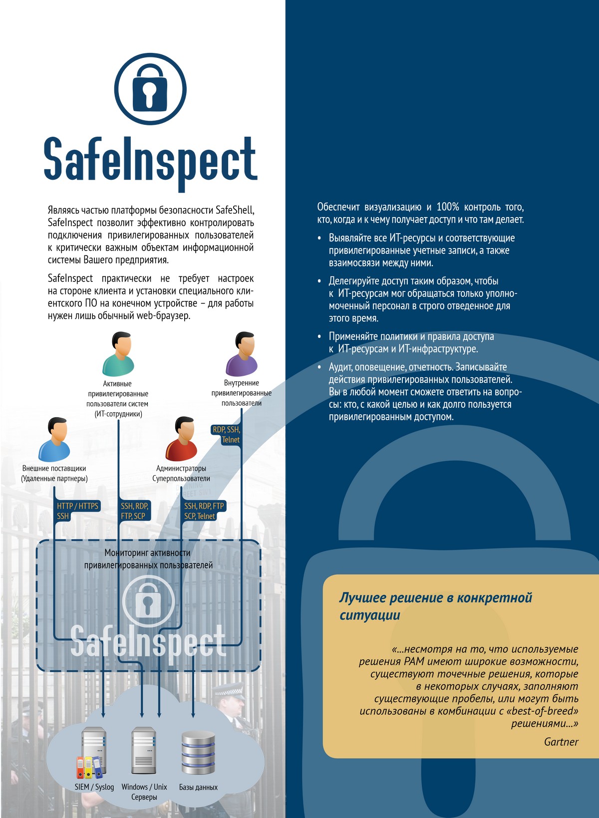 Система SafeInspect позволяет выполнять ряд необходимых задач по управлению доступом к привилегированным аккаунтам: • Жестко регламентировать и унифицировать доступ к привилегированным учетным записям для большого количества программных, аппаратных и программно-аппаратных систем и приложений; • Реализовать рабочий процесс персонифицированного доступа к привилегированным учетным записям к конкретным системам, на заданный промежуток времени, с четким обоснованием необходимости и требуемым количеством согласований; • «Из коробки» управлять привилегированными учетными записями и реализовывать доступ к широкой линейке программных, аппаратных и программно-аппаратных систем; • Надежно сохранять информацию о привилегированных учетных записях в специализированном хранилище; • Добавлять в систему новые типы объектов управления при их отсутствии в базовом варианте; • Обеспечивать безопасную работу с привилегированными учетными записями для программ и приложений, работающих от имени администратора; • Отслеживать в реальном времени выполнение заданных команд; • В реальном времени контролировать привилегированные сессии с возможностью прерывания в случае необходимости; • Записывать информацию о привилегированных сессиях в формате .ogv или/и в текстовом формате в случае работы из командной строки; • Использовать мощные средства поиска при анализе записей привилегированных сессий в процессе расследований; • Изолировать (проксировать) привилегированные сессии; • Обеспечивать доступность и отказоустойчивость. |