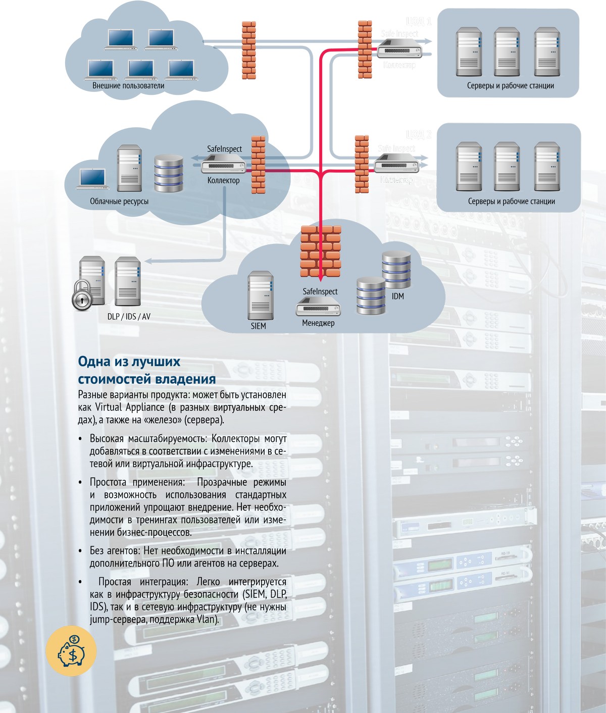 Защищенность от внешних воздействий, а также обеспечение высокой доступности Система работает в подготовленной защищенной среде, где отключены все ненужные сервисы и обеспечена защита от хакерских атак. Кроме того, система обеспечивает возможность работы, как в автономном, так и в распределенном режиме, когда датчики сбора информации могут быть распределены по сети с обеспечением возможности резервирования, а вся информация собирается на выделенном сервере, где хранится и обрабатывается. Имеется возможность обеспечить аутентификацию, в том числе, и двухфакторную. Таким образом, система защищена от воздействий извне, обладает широкими возможностями по аутентификации и обеспечению высокой доступности. Интеграция в инфраструктуру Компании Система интегрируется с современными системами SIEM, IPS, Web filters, DLP позволяя повысить эффективность как своей работы, так и работы других подсистем. Например, при интеграции с SIEM системами можно будет получить гораздо более высокую оперативность в выявлении инцидентов и APT атак, и более детальное расследование того, что происходило. |