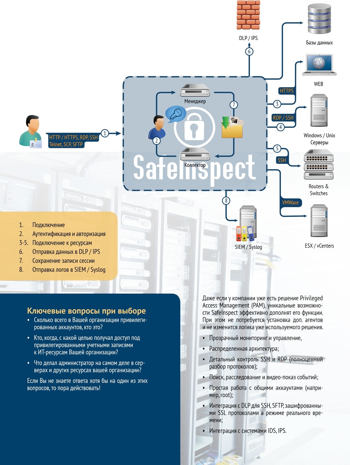 Подстановка пользователей Каждый пользователь входит в сервер, используя свои учетные данные, и получает доступ к разрешенным устройствам без выполнения второй процедуры входа. При этом на сервере будет использоваться совершенно другой ключ доступа и пароль, но пользователь этого не увидит. Такая схема позволяет обеспечить простоту и прозрач ность доступа и одновременно обеспечить высокую защищенность сервера и невозможность обхода системы SafeInspect. Аудит файловых операций Аудит проводится для протоколов SCP, SFTP, HTTP(s). SafeInspect создает необходимый список всех файловых операций, который может направляться в систему DLP или IPS в режиме реального времени. Надежная аутентификация Система позволяет обеспечить аутентификацию посредством сертификатов. Привилегированные пользователи могут использовать технологию входа по сертификатам, что позволяет также использовать двухфакторную аутентификацию с использованием токенов (например, E-token, Ru token), и систему одноразовых паролей. Контроль подключений с учетными записями с расширенными правами Система позволяет определять кто, откуда, когда и как имеет доступ к вашим серверам, а также при помощи каких протоколов он может подключаться. Имеется возможность создавать множественные политики доступа к аккаунтам на серверах с разными ключами доступа (например, если нужно обеспечить доступ к аккаунту «root», то это можно легко сделать, обеспечив, в том числе, и проверку с каких адресов и по каким портам будет осуществляться доступ, и другие параметры). Таким образом, несмотря на то, что на самом сервере порой невозможно сделать различие между несколькими администраторами, SafeInspect позволяет разграничить и провести аудит действий отдельно каждого из администраторов. Работа без использования агентов SafeInspect не требует специальных установок на администрируемых устройствах или рабочих станциях, что обеспечивает быстрое развертывание системы. Нет необходимости в постоянном тестировании версий (например, когда инсталлируются патчи операционной системы, часто появляются проблемы с агентами). |